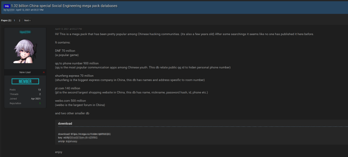 Recently, during our routine darkweb and cybercrime monitoring, Cyble researchers came across a Threat Actor (TA) posting more than 1.3 billion records containing sensitive information about Chinese citizens on a cybercrime forum called RaidForums. The data sources include: