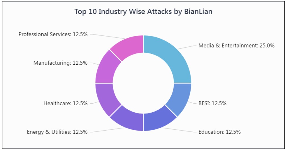 The ransomware has targeted many well-known organizations (9 victims so far) across several industry sectors such as Manufacturing, Education, Healthcare, BFSI, etc. In the figure below, we have prepared a breakdown of the industries targeted by the BianLian ransomware.