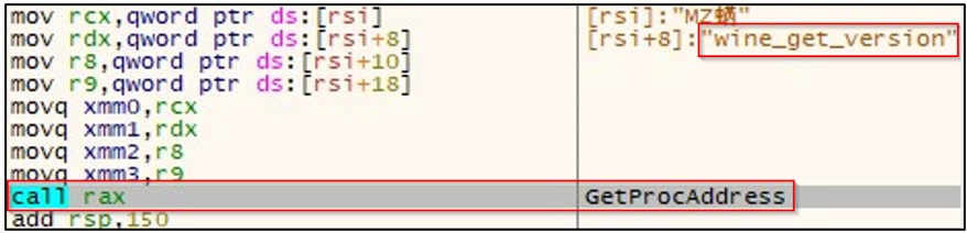 Upon execution of the ransomware, it attempts to identify if the file is running in a WINE environment by checking the wine_get_version() function via the GetProcAddress() API.