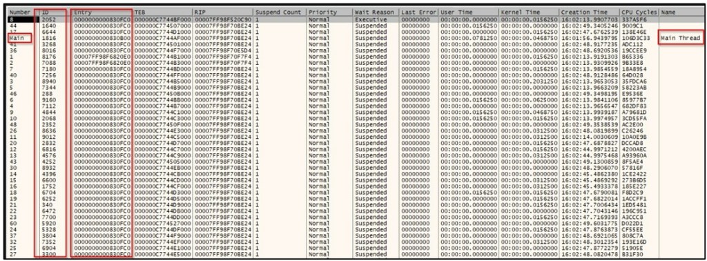 Then, the ransomware creates multiple threads using the CreateThread() API function to perform faster file encryption, making reverse engineering the malware more difficult. The below figure shows the multiple threads created by the ransomware.