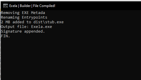 Upon the successful inclusion of all the user-selected features, the builder proceeds to compile the executable. The image below displays the successful creation of Exela Stealer by the builder without any errors.