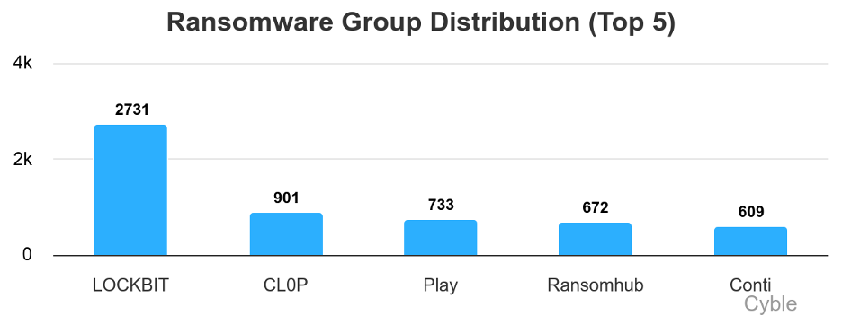 The additional CL0P victims made the group the most active for the month, followed by RansomHub and Akira (chart below).