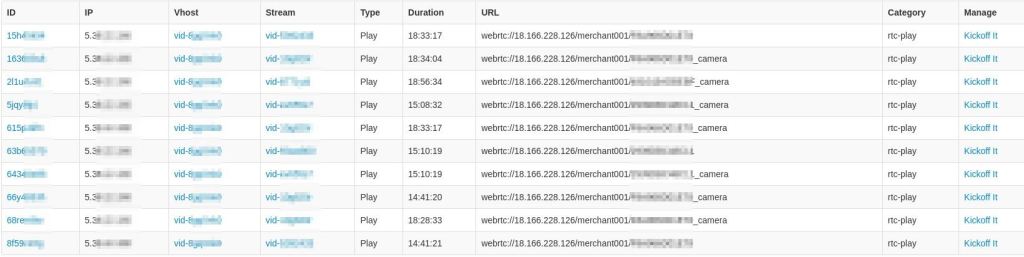 Upon analyzing both actions, we observed that Greenbean Trojan utilizes the same WebRTC method responsible for video streaming. However, it was challenging to precisely distinguish between these two actions. Despite this, the malware effectively implemented the live streaming feature, as evidenced by entries in the test SRS panel related to both actions, as shown in the figure below.