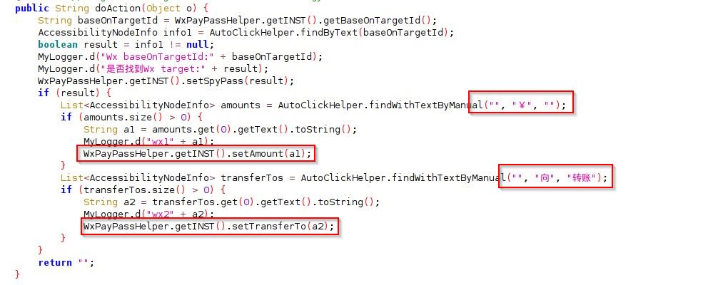 The following illustration depicts an instance involving the WeChat application. The malware, employing accessibility services, scans the active window for the ¥ currency symbol and attempts to retrieve the amount to be transferred. Similarly, it examines the presence of the Chinese words “向” (translating to “towards”) and “转账” (translated to “transfer”) to determine the recipient of a money transfer. Moreover, the malware can modify information within the fields associated with the recipient as it can receive the command “C20” along with the corresponding input data. Using this feature, malware may transfer the money from the victim’s account to the Threat Actor’s account, leading to financial loss to the victim.
