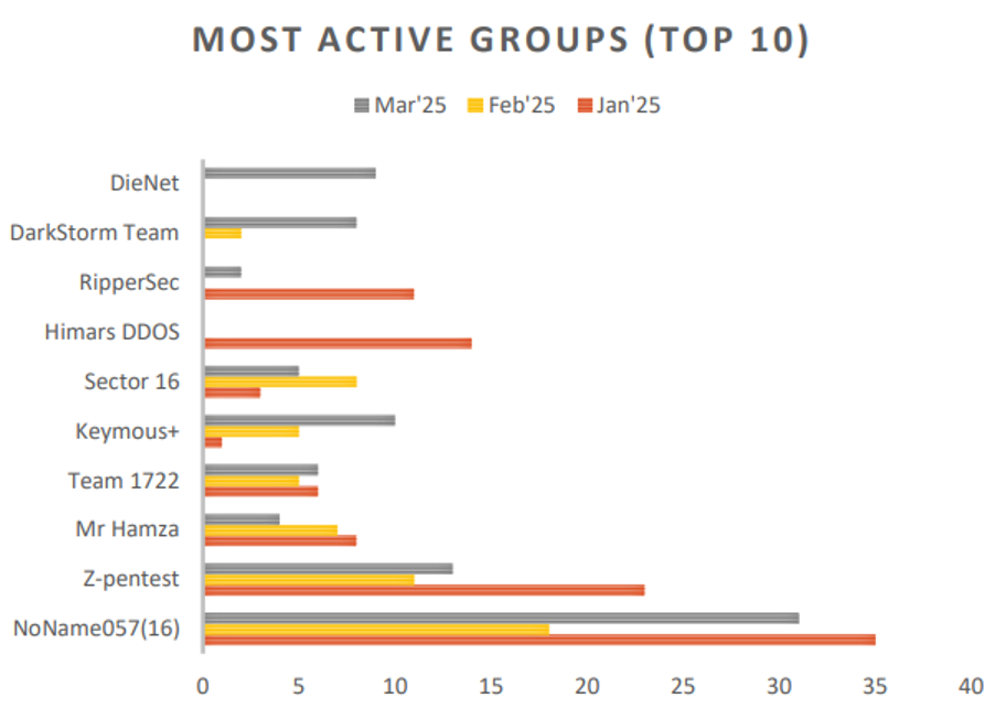 Pro-Russian hacktivists were the most active in the first quarter, led by NoName057(16), Hacktivist Sandworm, Z-pentest, Sector 16, and Overflame. The groups primarily targeted NATO-aligned nations and Ukraine supporters.