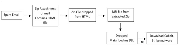 Recently, Cyble Research Labs came across a Twitter post where a researcher observed this malware spreading through spam campaigns. Additionally, it downloads Cobalt Strike Beacons as payloads in compromised systems. Figure 1 shows the infection chain of the Matanbuchus malware.