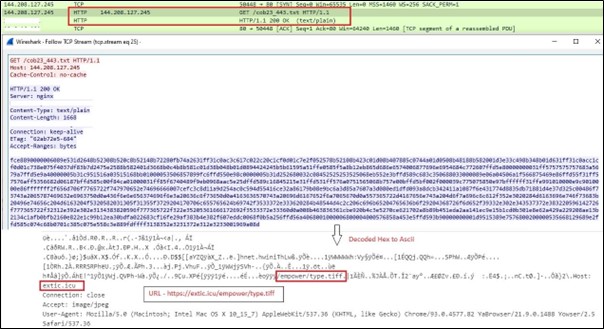 The malware first downloads a file “cob23_443.txt” from hxxp://144.208.127[.]245/cob23_443.txt. This is a hexadecimal binary file that will further be converted to ASCII characters and then downloads Cobalt Strike Beacons from hxxps://extic[.]icu/empower/type.tiff.