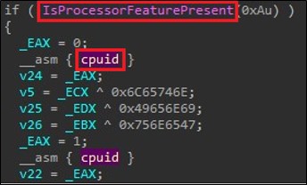 Before downloading the DLL file , it calls APIs such as IsProcessorFeaturePresent(), GetSystemTimeAsFileTime() , IsDebuggerPresent(), QueryPerformanceCounter() and cpuid to ensure that the malware is not running under a controlled environment such as VMware, Sandbox, etc.