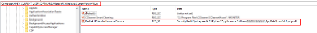 After copying the file to one of the previously mentioned locations, the stealer adds a Run entry to the Windows Registry, allowing the stealer file to run automatically when the user logs in. The image below shows the newly created Run entry within the Windows Registry.