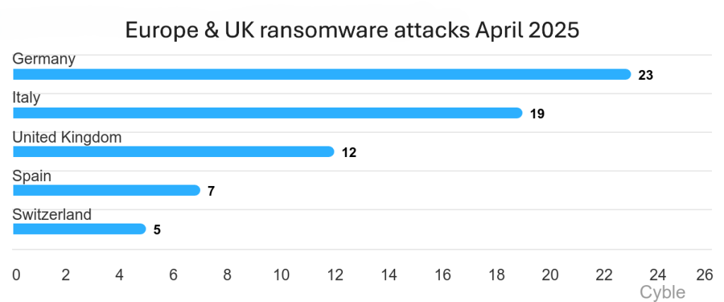 In the UK and Europe, Akira was the top attacker, while Spain and Switzerland rounded out the top five European countries for ransomware attacks (charts below). There were 108 claimed attacks in total in the region.