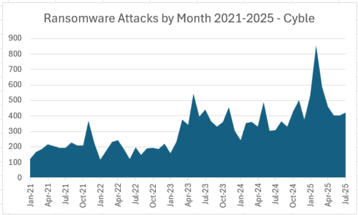 July’s totals marked the third consecutive monthly increase in ransomware victims, following a three-month downtrend that began after February saw a record 854 attacks (chart below). 2025’s lowest point (402 attacks in May) remains well above the low points of 2023 (161 in January 2023) and 2024 (243 in January 2024), suggesting that the long-term uptrend remains intact despite claimed victims being half of February’s record, which was driven by a high number of CL0P and RansomHub victims.