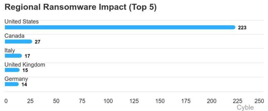 The U.S. was by far the most attacked country once again, its 223 victims, eight times greater than second-place Canada (chart below).