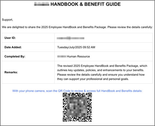 Once the victim opens the attached PDF decoy, they are shown what appears to be a legitimate document featuring the organization’s official logo, crafted to build trust. The document contains 4 pages with a professional-looking Table of Contents with sections grouped under HR-related topics such as Recruitment & Onboarding, Attendance & Work Policies, Employee Records, Performance & Conduct, and Health & Safety (see Figure 2).