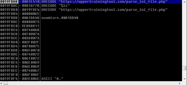 The Exfiltrate component has a hardcoded C&C URL, decoded in the memory as depicted in the debugger image below. As seen in earlier variants, the Parse_ini_file.php is used as part of the layer 1 communication and the functionality to get commands from the C&C server.