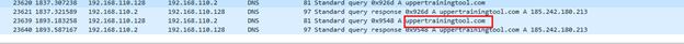 The network capture depicts multiple connection requests to the attacker layer 1 C&C server (uppertrainingtool[.]com) as showcased in the Wireshark image below.
