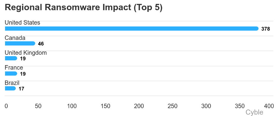 Even as North American ransomware attacks have soared, the next-most attacked regions have stayed relatively stable. France, for example, had 18 attacks to start in 2024 and has seen 19 thus far in 2025 (chart below).