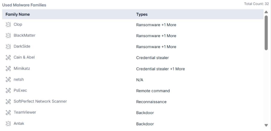 - Ransomware Families: Clop, BlackMatter, DarkSide